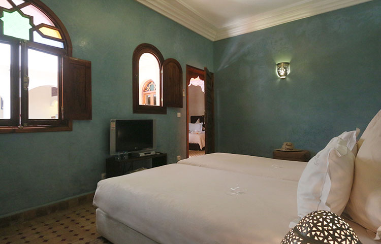 Chambre Double Superieure - Riad L'EmirSituée au premier étage, cette chambre aux murs en tadelakt gris clair et vert anis offre des vues sur le patio.